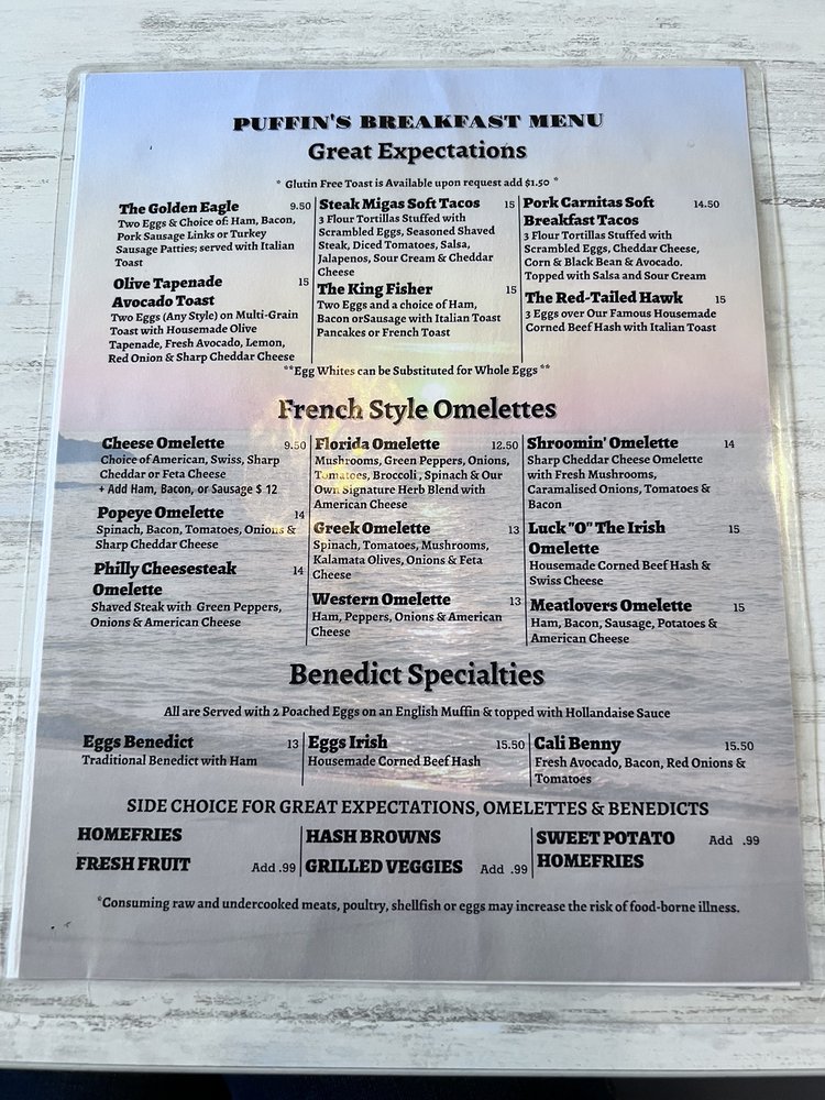 Puffin's Restaurant, a charming spot located at 95 Main St in Millbury, MA, offers a delightful mix of New American and classic American cuisine with a focus on breakfast and brunch options. The menu boasts a variety of mouthwatering dishes, including the indulgent Banana Fosters French Toast and the flavorful Prime Rib Of Beef Omelette. For those looking for something more savory, the Mexicali Loaded Homefries and Cow & Chicken Sear & Savor Prime Ribeye Steak & Eggs are sure to satisfy. With a range of vegetarian options available, Puffin's Restaurant caters to all dietary preferences. The cozy ambiance, free Wi-Fi, and outdoor seating make it an excellent choice for a leisurely meal. Don't miss out on the lunch specials like the French Dip and Tuna Melt. Puffin's Restaurant truly offers a delightful dining experience for all food enthusiasts.